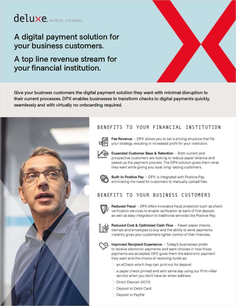 Deluxe Payment Exchange (DPX) is a digital payment solution for your business customers, and it can be a top-line revenue stream for your financial institution. In this timely white paper, you’ll learn the benefits DPX can bring to your FI, including: